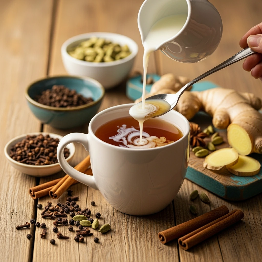 Put all spices in a pot, add water, cover the pot, bring to a boil, reduce heat and simmer for one to three hours. Add more water if too strong. Remove from heat and let cool. Strain and store in the refrigerator. Reheat when you want a cup, adding hot milk and sweetener to taste.